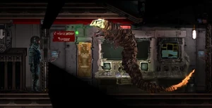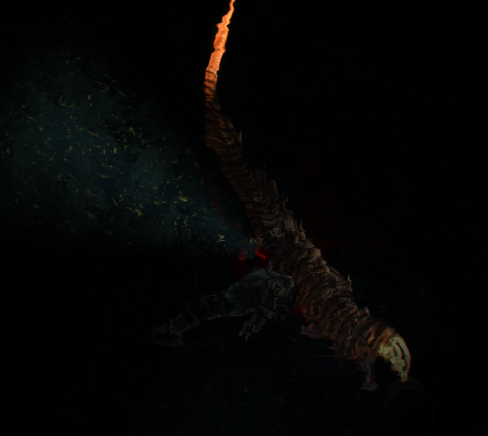 Tiger Threshers are eel-like creatures that have leopard-like splotches towards the front of their body, and small stripes towards their tail (like a tiger). Their head is transparent and bioluminescent, like that of a barreleye fish. Like the head of the Tiger Thresher, their tail also glows, but not as brightly as their head. The spine of the Tiger Thresher has spiny protrusions that cover the majority of their back. Tiger Threshers do not have visible eyes, like most of the sea-life on Europa.